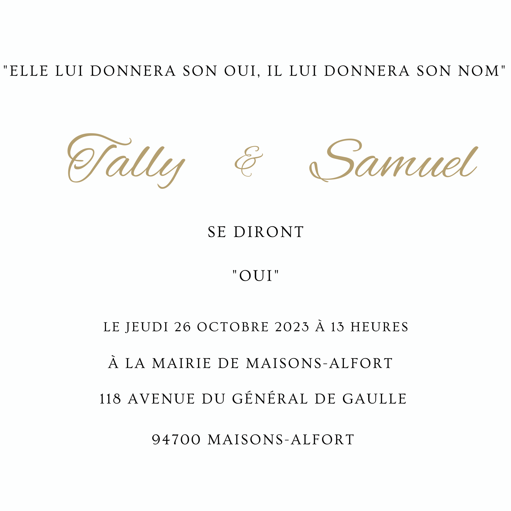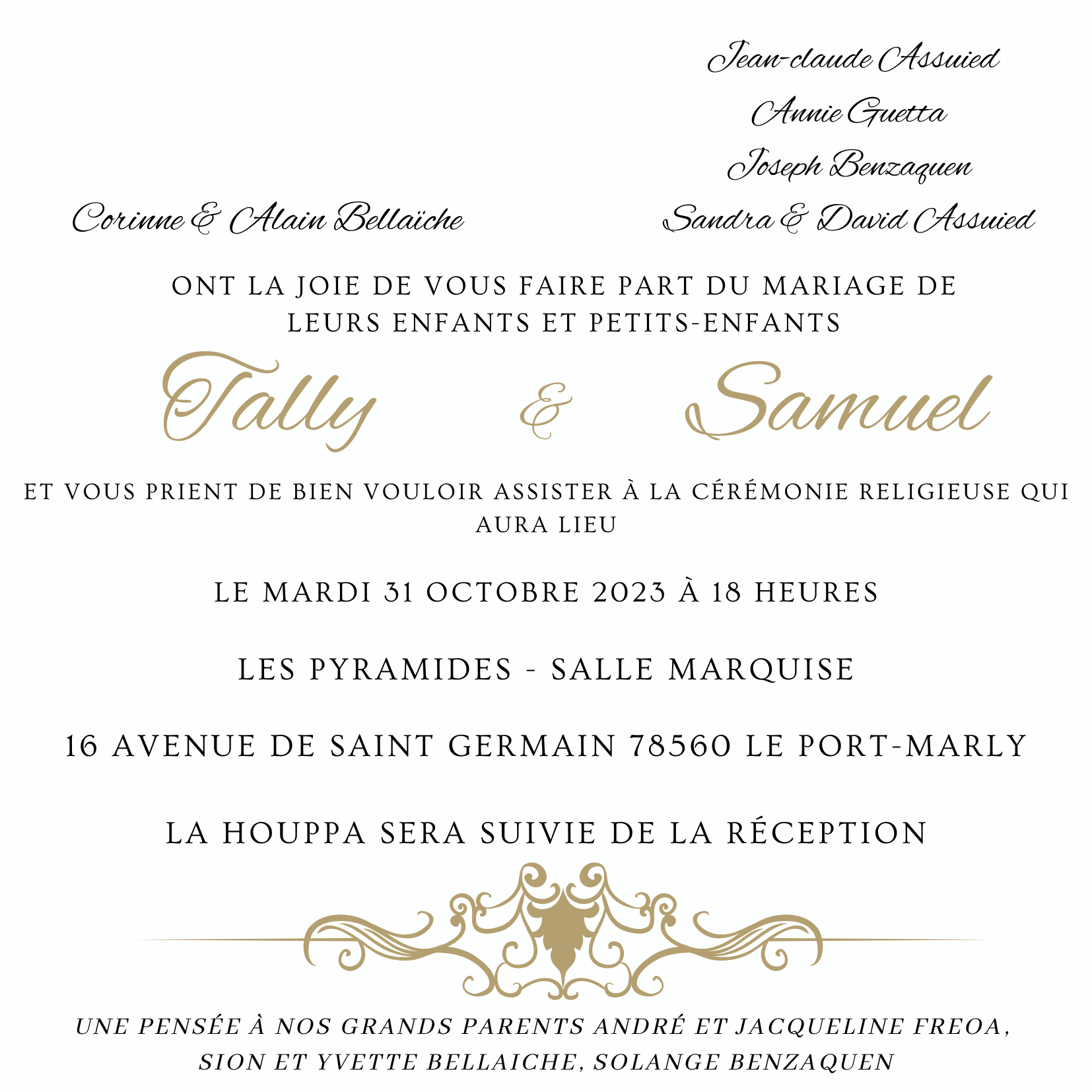 Mairie Houppa & Soirée “קול ששון וקול שמחה קול חתן וקול כלה” Confirmer Ma Présence Réponse souhaitée dès réception. Votre nom Votre prénom La réception - 31 octobre 2023 AssisterontN'assisteront pas Nombre de Personnes 123456 Photos